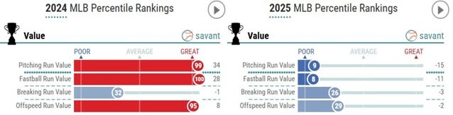 The above image taken from Baseball Savant doesn't tell the whole story with Miller, but I don't recall ever seeing such a drastic year-over-year drop with a player's run values. Considering he pitched most of the 2025 season at 26 years of age, it's not something that can be explained away by father time getting the best of him. I do think there's a pretty clear explanation, though, and it's that Miller was never healthy.