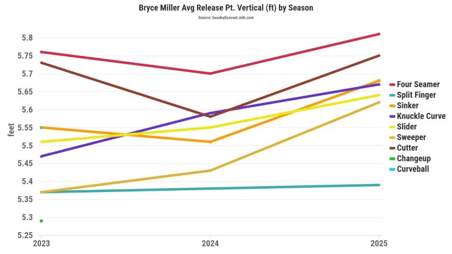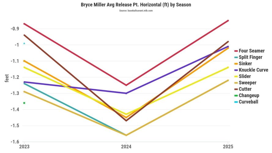 Whether consciously or unconsciously, pitchers will often change their mechanics when they're hurt. Sure enough, as you can see above, Miller's vertical and horizontal release points were drastically different in 2025 than they were in 2024. It changed the action on his pitches, as the spin rate on all seven of his offerings was up. His control (5.7 percent walk rate from 2023-2024, 8.7 percent walk rate in 2025) and command (104 Location+ from 2023-2024, 97 Location+ in 2025) both deteriorated. His strikeout rate bottomed out to 18.9 percent after it came in at 23.4 percent the previous two seasons.